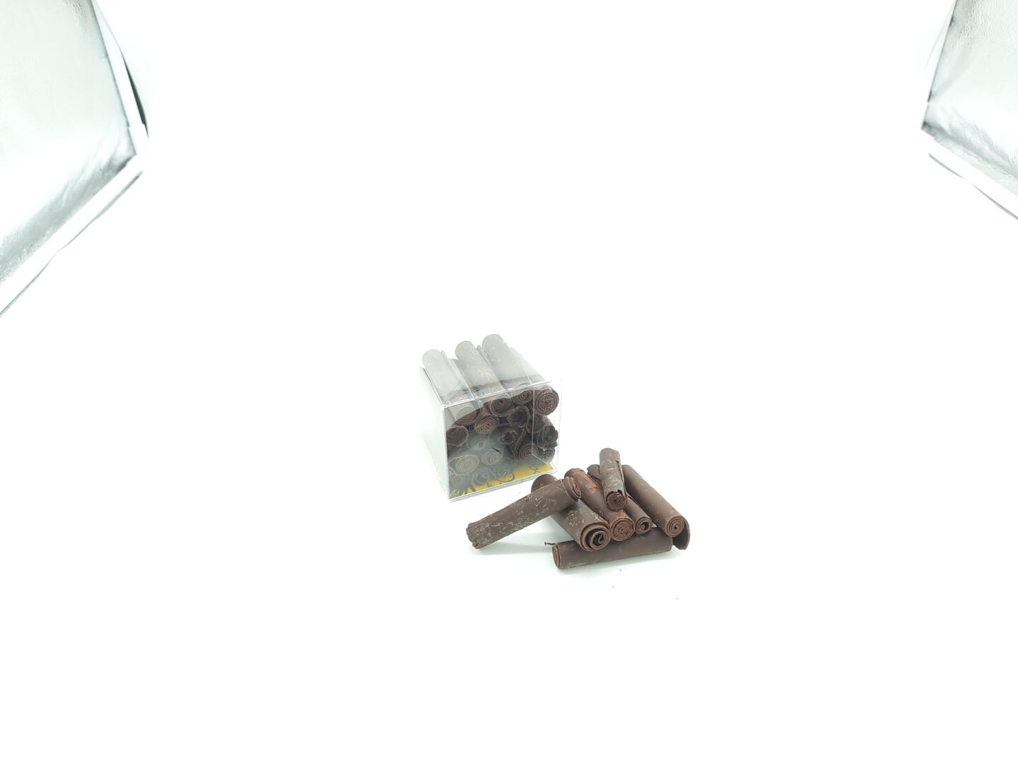 La confection des copeaux de chocolat est une affaire délicate. En effet après avoir étaler sur le marbre une fine couche de chocolat, il faut patienter quelques instants pour obtenir une cristallisation rapide et partielle du chocolat. C’est à cet instant que nous mettons en forme les copeaux dans une impulsion nette et précise, en grattant avec un outil tranchant sur le marbre.